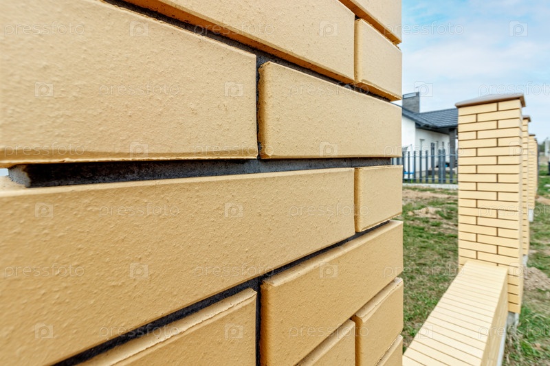 Фрагмент современного забора, облицованного декоративным кирпичом в старинном стиле