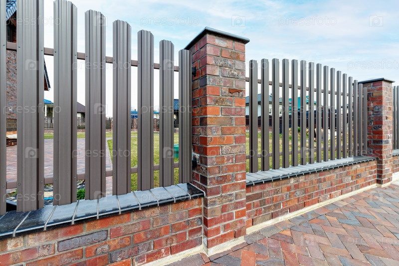 Фрагмент современного забора, облицованного декоративным кирпичом в старинном стиле