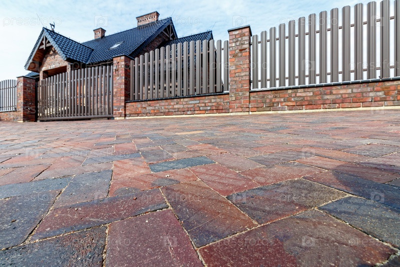 Парковка перед частным домом из декоративного камня в старинном стиле