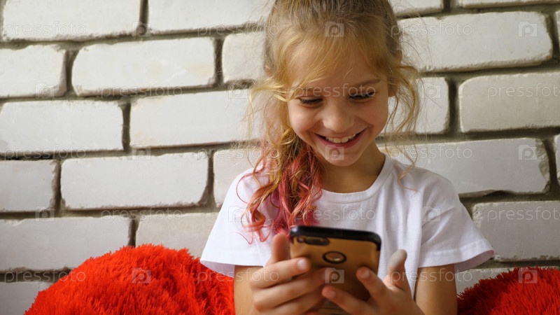 Крупный план симпатичной девочки школьного возраста, просматривающей социальные сети на своем смартфоне. На заднем плане стена из белого кирпича. Зависимость ребенка от гаджетов