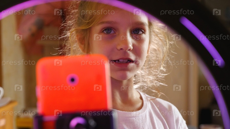 Красивая, жизнерадостная девочка-блогер записывает видео на свой смартфон, стоя в комнате перед кольцевой лампой. Домашний блог