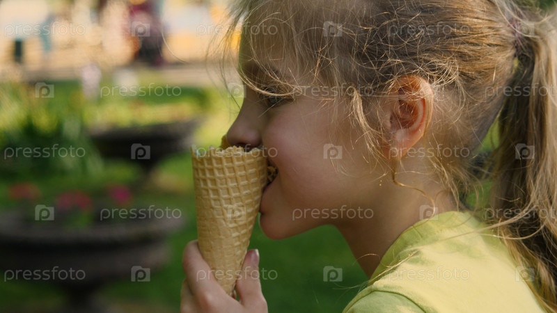Крупный план школьницы, жующей зубами вафельный стаканчик. Вид сбоку. Ребенок ест мороженое в городском парке. Беззаботное счастливое детство