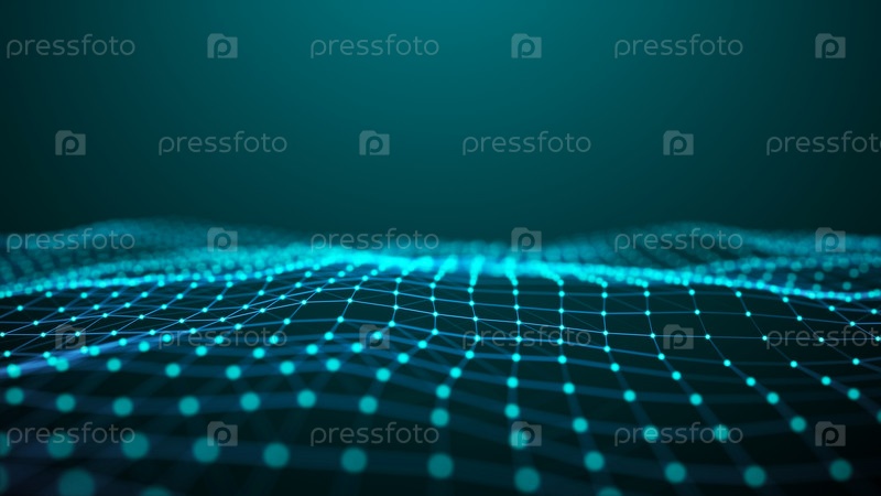 Волна с точками и линиями соединения. Подключение к сети. Аннотация технологии. Искусственный интеллект. Синий фон. 3d визуализация