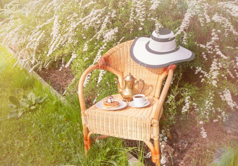 Кофейник, чашка кофе, блины и шляпа на плетеном стуле в саду на фоне цветов spiraea x cinerea 'Grefsheim'