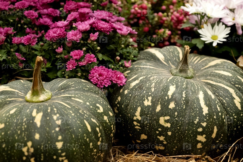 Собранные зеленые тыквы на украшенной цветами хризантемы торговой площади на осенней фермерской ярмарке