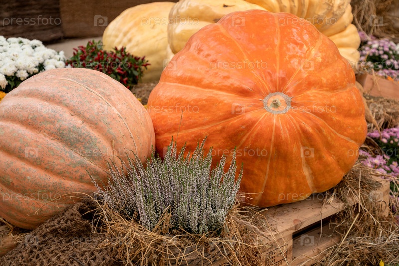 Собранные апельсиновые тыквы на витрине фермерского рынка