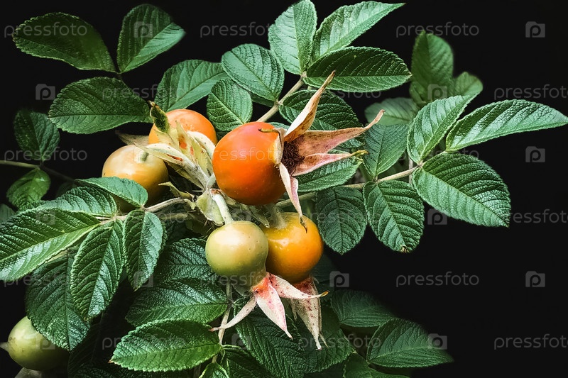 Большие ягоды шиповника с зелеными листьями на черном фоне