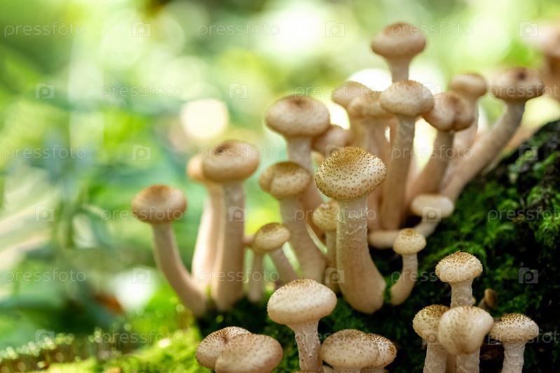 Куча грибов Armillaria mellea в лесу осенью растет на замкнутом стволе дерева