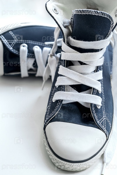Старые синие кроссовки с белыми шнурками на светлом фоне