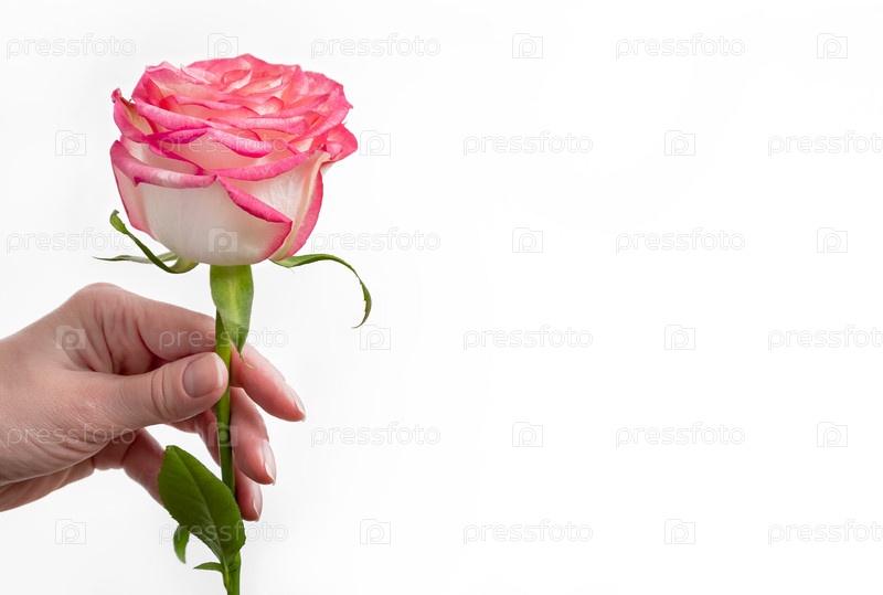 Женская рука держит розовую розу. Закрыть. белый фон