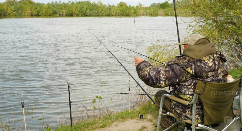 Рыбак с удочкой сидит в кресле на берегу реки. На заднем плане зеленые деревья. Концепция отдыха и хобби на природе