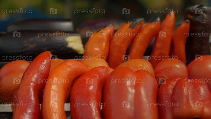 Крупный план красного перца, болгарского перца и баклажанов на гриле. Дым идет через овощи. Приготовленное аджапсандали, традиционное грузинское блюдо
