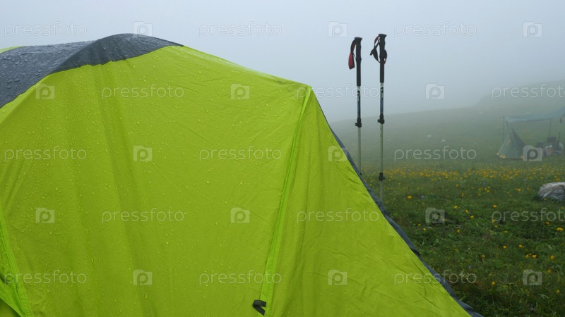 Крупный план зеленой палатки с каплями дождя. Рядом с ним втыкаются в землю трекинговые палки. Отдыхающие окутаны туманом. Пеший туризм. Спортивный отдых. Путешествие и туризм