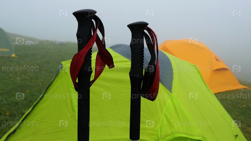 Крупный план треккинговых палок на фоне зеленых и оранжевых палаток. Участники похода окутаны туманом. Пеший туризм. Спортивный отдых. Путешествие и туризм