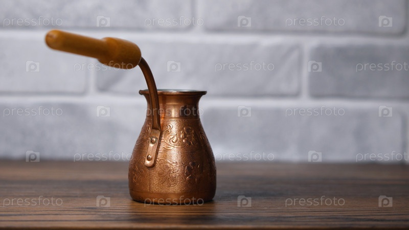 Небольшая медная жезва на деревянном столе. На заднем плане светлая каменная стена. Концепция турецкого кофе