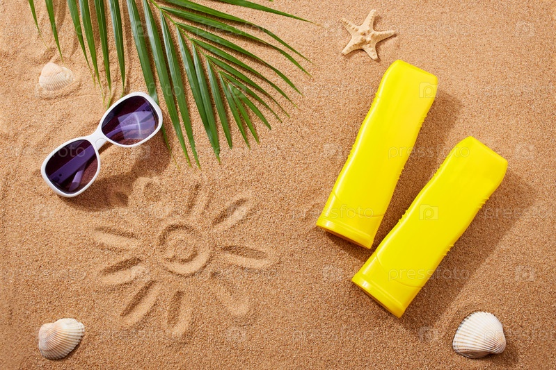 Солнцезащитные кремы, солнцезащитные очки, ракушки и пальмовые листья на песке на пляже