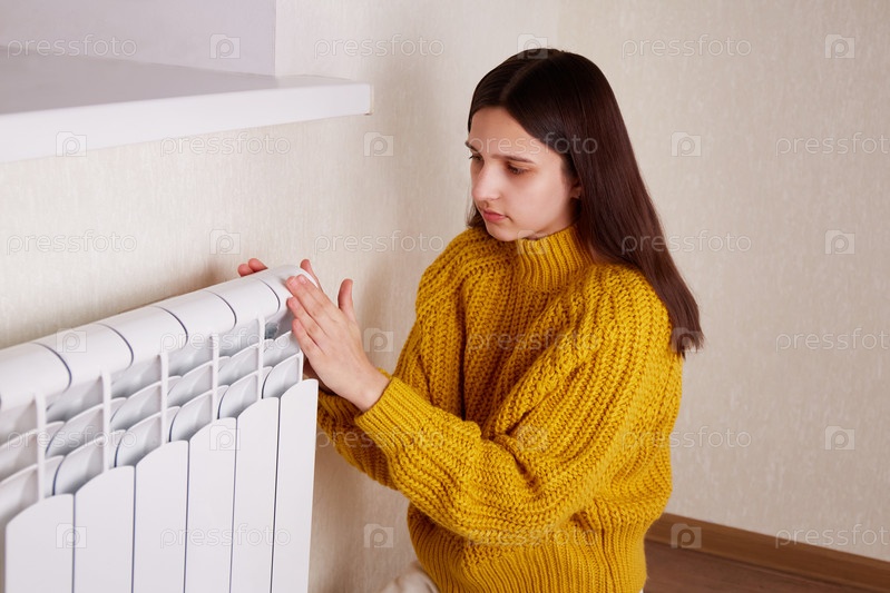 Девушка греет руки на обогревателе. Низкая температура в доме
