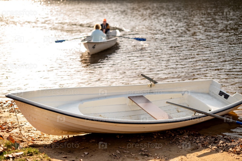 Старая лодка лежит на берегу на фоне ряби воды озера с плавающей лодкой