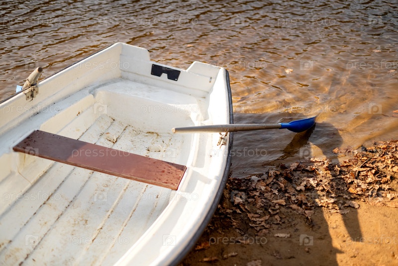 Старая лодка с веслами лежит на берегу озера на фоне ряби воды озера