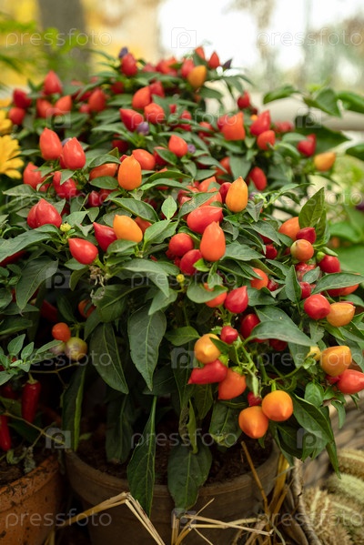 Декоративный красочный перец паприки, растущий в цветочном горшке в саду во дворе