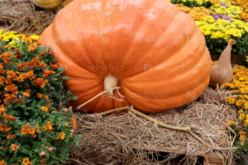 Гигантская оранжевая тыква на осенней фермерской выставке