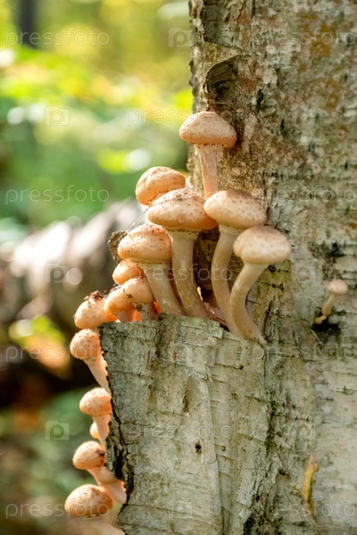 Пучок армиллярии или медовых грибов растет из коры березы