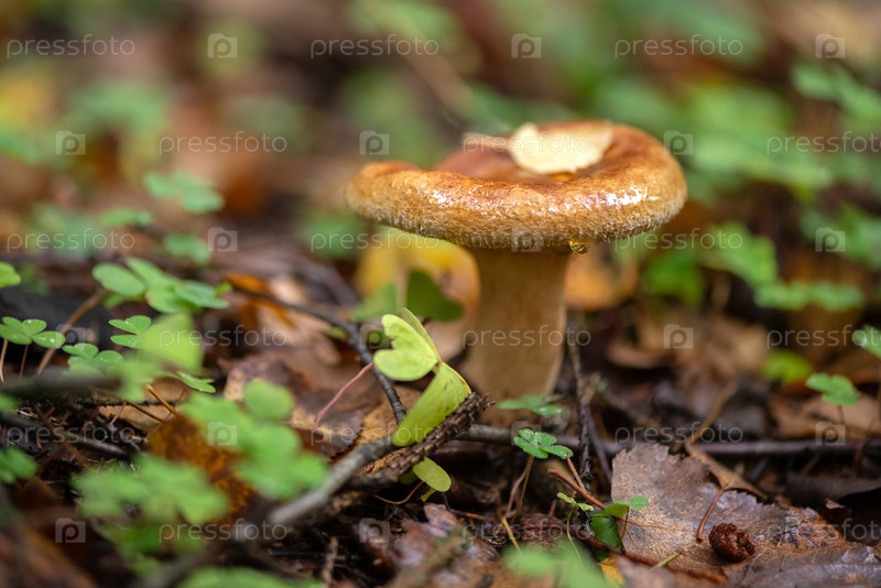 Условно съедобный гриб Paxillus, растущий в осеннем лесу среди упавших листьев