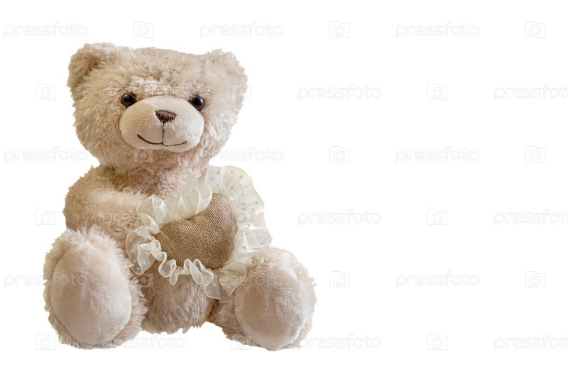 Милый плюшевый мишка держит сердце в лапах, изолированных на белом