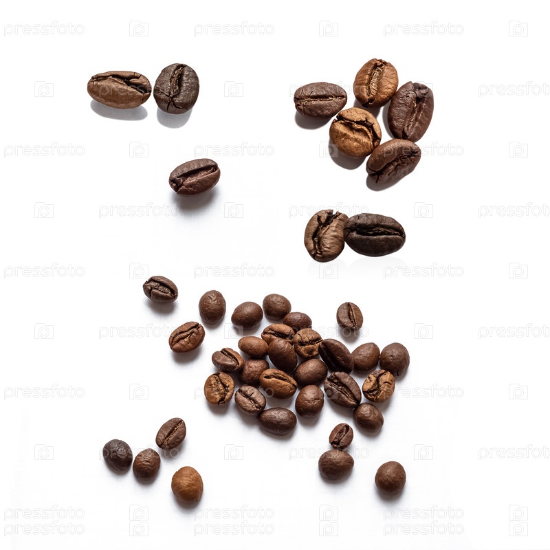 Набор темных жареных кофейных зерен, разбросанных на белом фоне