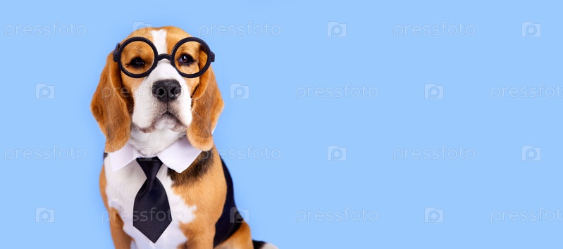 Собака-бигль с круглым стеклом и галстуком на синем изолированном фоне