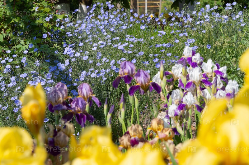 Весенний цветущий луг. Голубые цветы льна и цветущие синие и желтые ирисы на клумбе