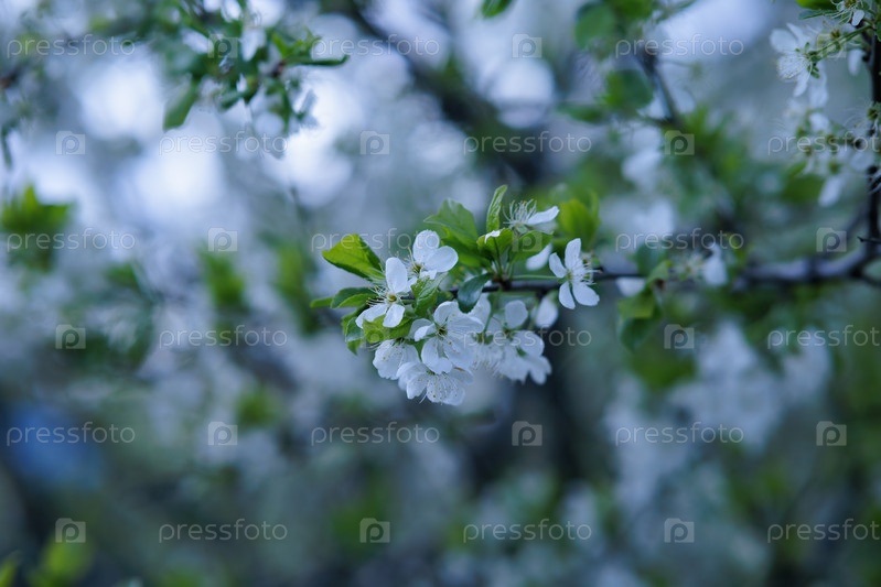 Цветущая ветка вишни в весенний день. Малая глубина резкости