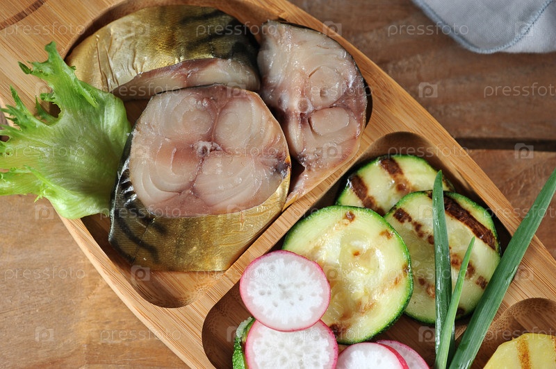Копченая скумбрия, жареные кабачки - на деревянном деревенском фоне
