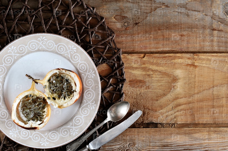 Маракуйя гранадилья или гренадия на деревянном деревенском фоне