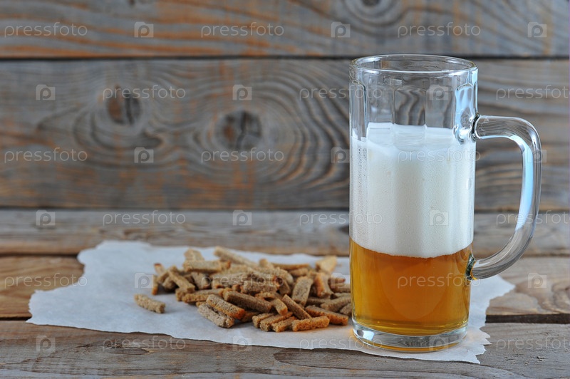 Стеклянная кружка с пивом с пеной, закусочные крекеры