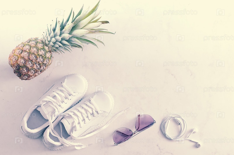 Кроссовки, ананас, солнцезащитные очки и наушники