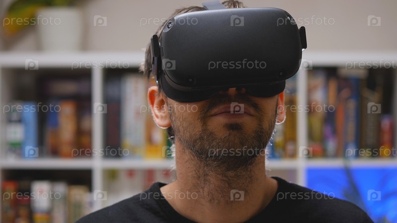 Крупный план бородатого мужчины в очках виртуальной реальности на голове. Домашний интерьер. VR-шлем для развлечений, обучения и игр