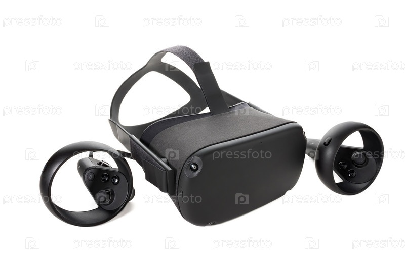 Комплект виртуальной реальности.Джойстик и шлем VR изолированы на белом фоне. Два контроллера и очки виртуальной действительности.Вид сверху со стороны