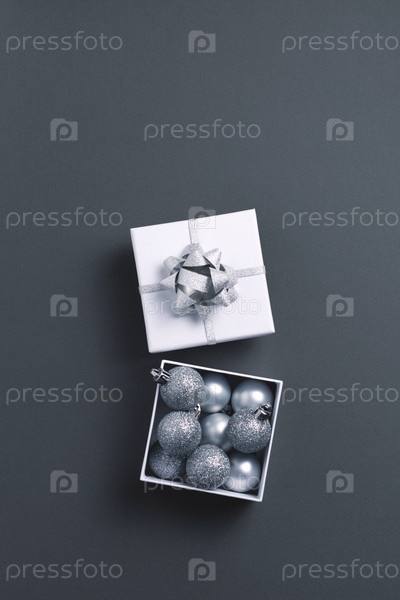 Праздничная подарочная коробка с рождественскими украшениями на сером фоне