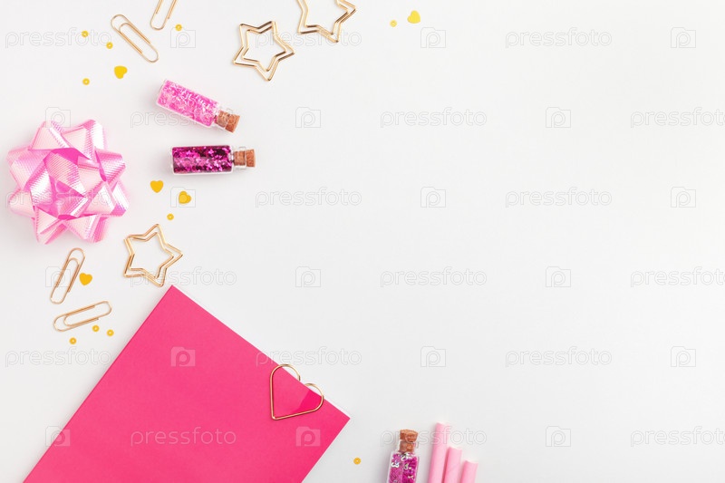 Белый фон с розовым декором девушки. Розовый праздничный бант, дневник, золотые скрепки, место для копирования