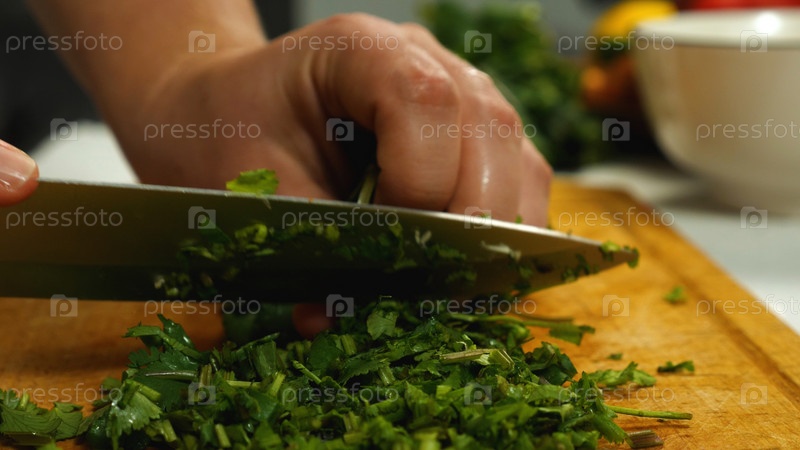 Крупный план повара, нарезающего пучок петрушки. Вид сбоку. Вегетарианская кухня. Концепция вкусной и здоровой пищи