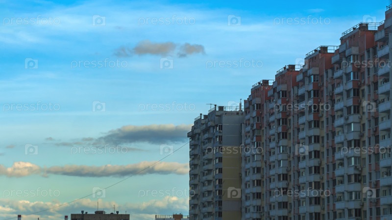 Вечернее голубое небо с летающими облаками на фоне многоэтажного жилого дома. Красивый пейзаж окраины города