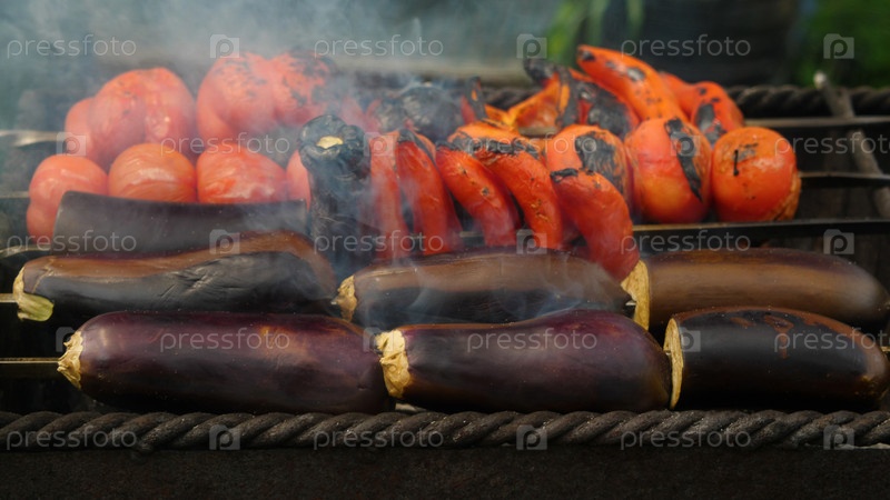Макро приготовления на гриле баклажаны, перец и помидоры. Овощи на углях. Вкусная и здоровая еда. Приготовленный аджапсандали, традиционное грузинское блюдо