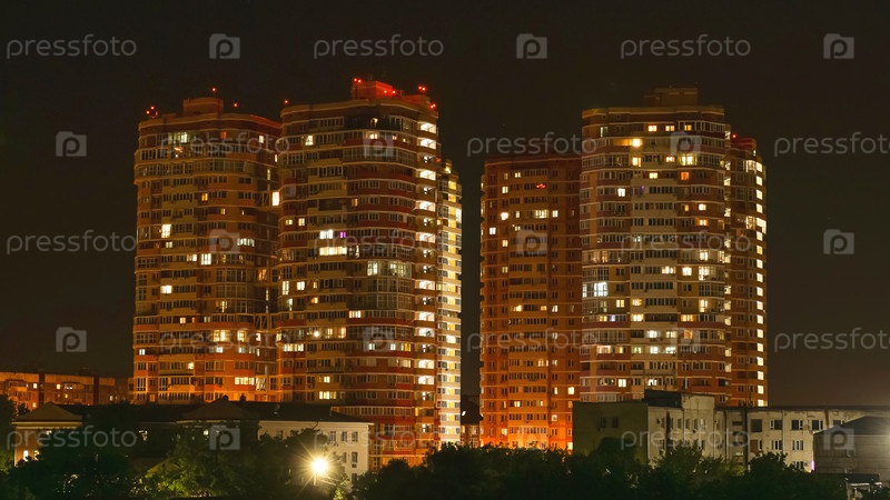 Многоэтажный жилой дом со светящимися окнами ночью. Крупный план. В окнах видно людей. Ночная жизнь большого города