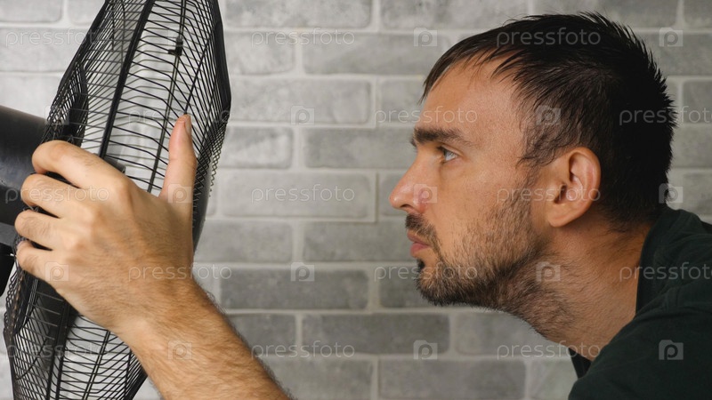 Крупный план бородатого мужчины, смотрящего на вентилятор. Мужчина приближает лицо к вентилятору. На заднем плане каменная стена светлого цвета. Вид сбоку. Концепция жаркой погоды