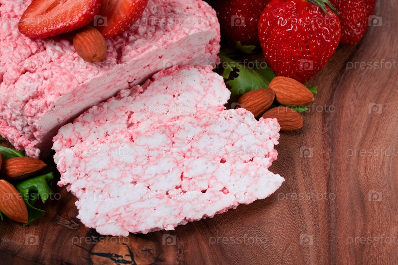 Сыр, пропитанный и ароматизированный красным вином, нарезанный ломтиками и подается с клубникой и миндалем на деревянной доске