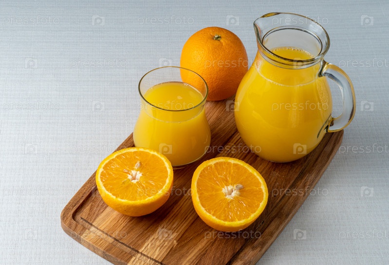 Свежий апельсиновый сок в стакане и целые апельсины на деревянной разделочной доске. Концепция здорового питания