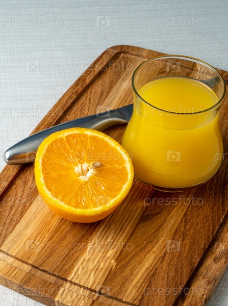 Свежий апельсиновый сок в стакане и целые апельсины на деревянной разделочной доске. Концепция здорового питания