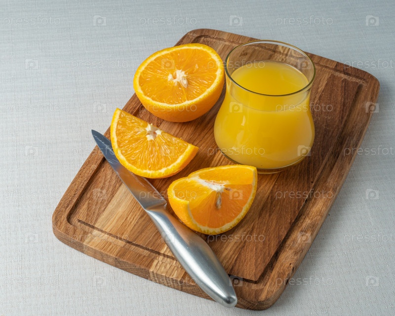 Свежий апельсиновый сок в стакане и целые апельсины на деревянной разделочной доске. Концепция здорового питания