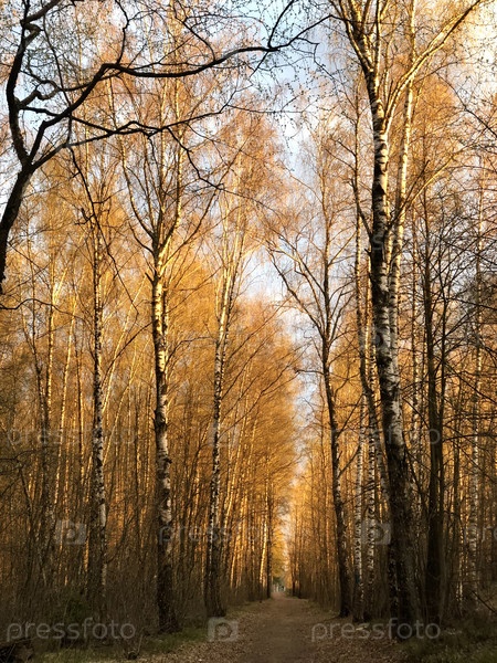 Золотой час на аллее лесных деревьев